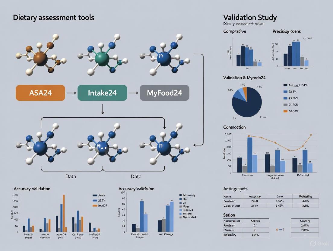 This guide provides an objective comparison of three prominent web-based dietary assessment tools: ASA24, Intake24, and myfood24. Framed within a broader thesis on comparative validation, we examine their performance through experimental data, usability metrics, and implementation protocols to inform researchers, scientists, and drug development professionals in selecting the most appropriate tool for their specific study contexts.