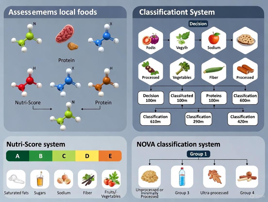 The escalating global burden of diet-related chronic diseases represents one of the most significant public health challenges of the 21st century [1]. Non-communicable diseases including obesity, cardiovascular diseases, type 2 diabetes, and cancer have become leading causes of premature mortality worldwide, responsible for approximately 80% of premature deaths from non-communicable diseases [1]. The economic costs are equally staggering, with the social cost of overweight and obesity alone estimated at approximately €20 billion (1% of GDP) in France [1]. Nutrition serves as a key modifiable determinant underlying this crisis, creating a powerful lever for public health intervention [1]. This application note provides researchers with validated methodologies for assessing the nutritional quality and processing characteristics of foods using the Nutri-Score and NOVA classification systems within local food assessment research contexts.