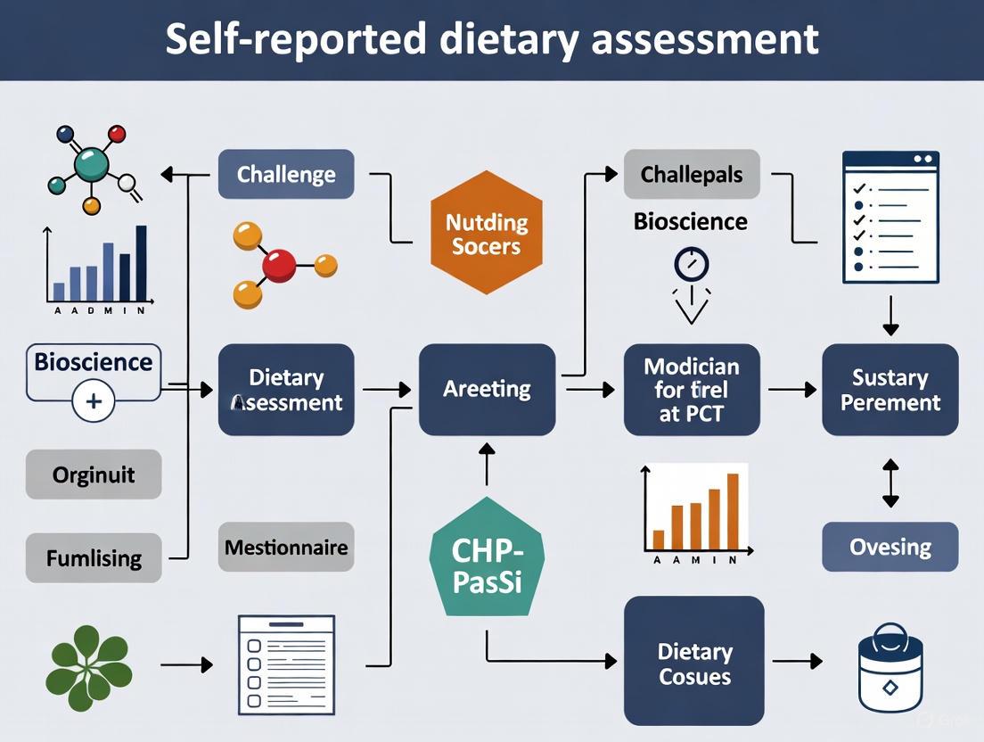 The challenges of self-reported dietary assessment are not merely methodological quirks but fundamental obstacles that attenuate diet-disease relationships and compromise the evidence base for public health guidelines and clinical trials. A path forward requires a paradigm shift from over-reliance on error-prone self-reports toward a multi-pronged approach. This includes the integration of objective biomarkers as a standard for validation, the development and adoption of sophisticated digital tools that minimize participant burden, and the rigorous application of statistical methods to correct for inherent biases. For biomedical and clinical research, this translates into a need for larger sample sizes, careful interpretation of diet-health associations, and investment in the development of robust, culturally competent assessment technologies. Ultimately, enhancing the accuracy of dietary intake measurement is paramount for advancing nutritional epidemiology, validating the role of diet in therapeutic drug development, and generating reliable evidence for precision nutrition.