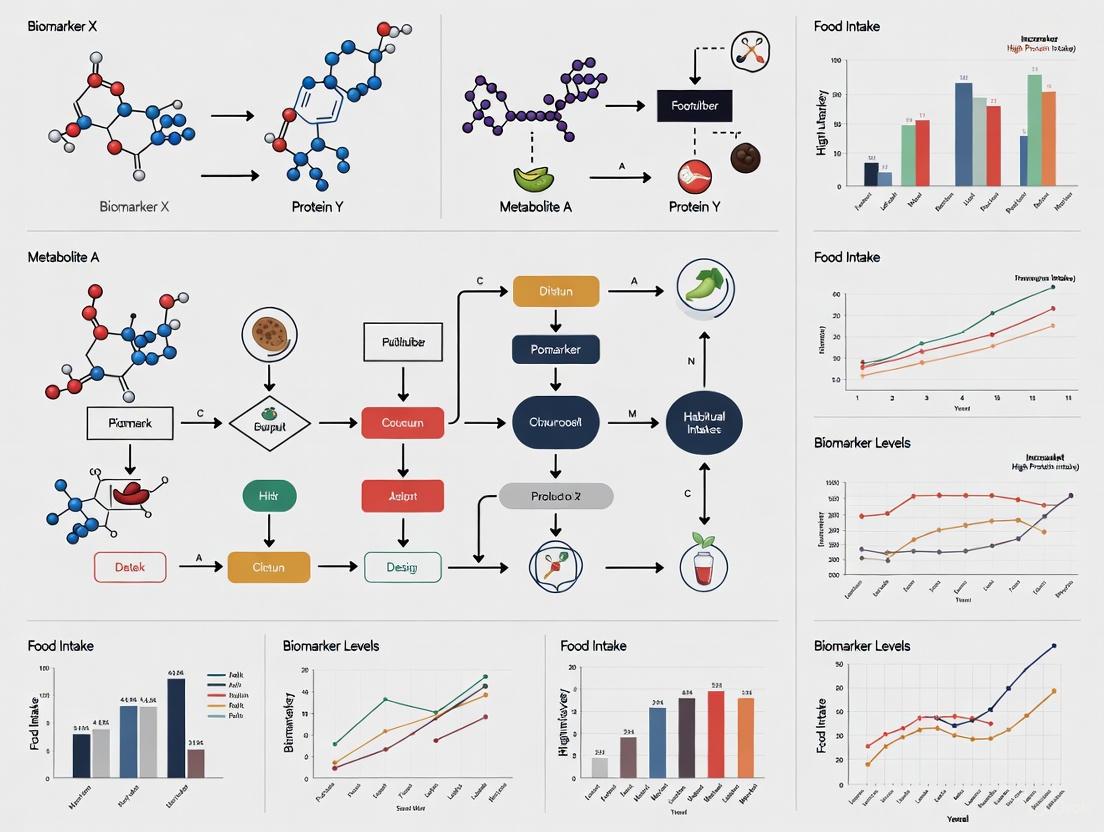The development and validation of robust biomarkers for habitual food intake represent a paradigm shift in nutritional epidemiology and biomedical research, offering an objective means to address critical limitations of self-reported dietary data. Key takeaways include the demonstrated utility of multi-biomarker panels for assessing complex dietary patterns, the importance of rigorous validation against established criteria, and the successful application of these biomarkers for calibrating measurement error in large-scale studies. Future directions should focus on expanding the library of validated biomarkers through initiatives like the DBDC, developing standardized analytical protocols and databases, and integrating biomarker data with other omics technologies. For researchers and drug development professionals, these advances will enable more precise investigation of diet-disease relationships, enhance monitoring of dietary adherence in clinical trials, and ultimately contribute to the development of targeted nutritional interventions and therapies. The ongoing expansion of this field promises to strengthen the scientific foundation of precision nutrition and its applications in public health and clinical medicine.