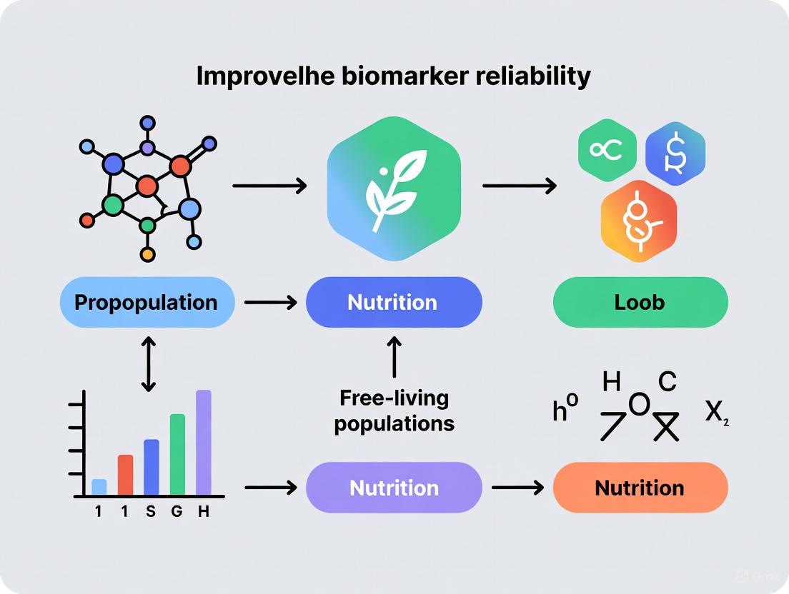 Improving biomarker reliability in free-living populations is a multifaceted endeavor essential for advancing precision medicine and nutritional epidemiology. Success hinges on moving beyond single-marker approaches to integrated multi-marker panels, rigorously validated against systematic criteria including plausibility, dose-response, and robustness. Future progress will depend on collaborative efforts to standardize protocols, leverage AI and multi-omics data, and establish large, diverse datasets that reflect real-world heterogeneity. By adopting these strategies, researchers can develop biomarkers that are not only statistically significant but also clinically actionable, ultimately enabling more accurate dietary assessment, better disease monitoring, and more personalized therapeutic interventions.
